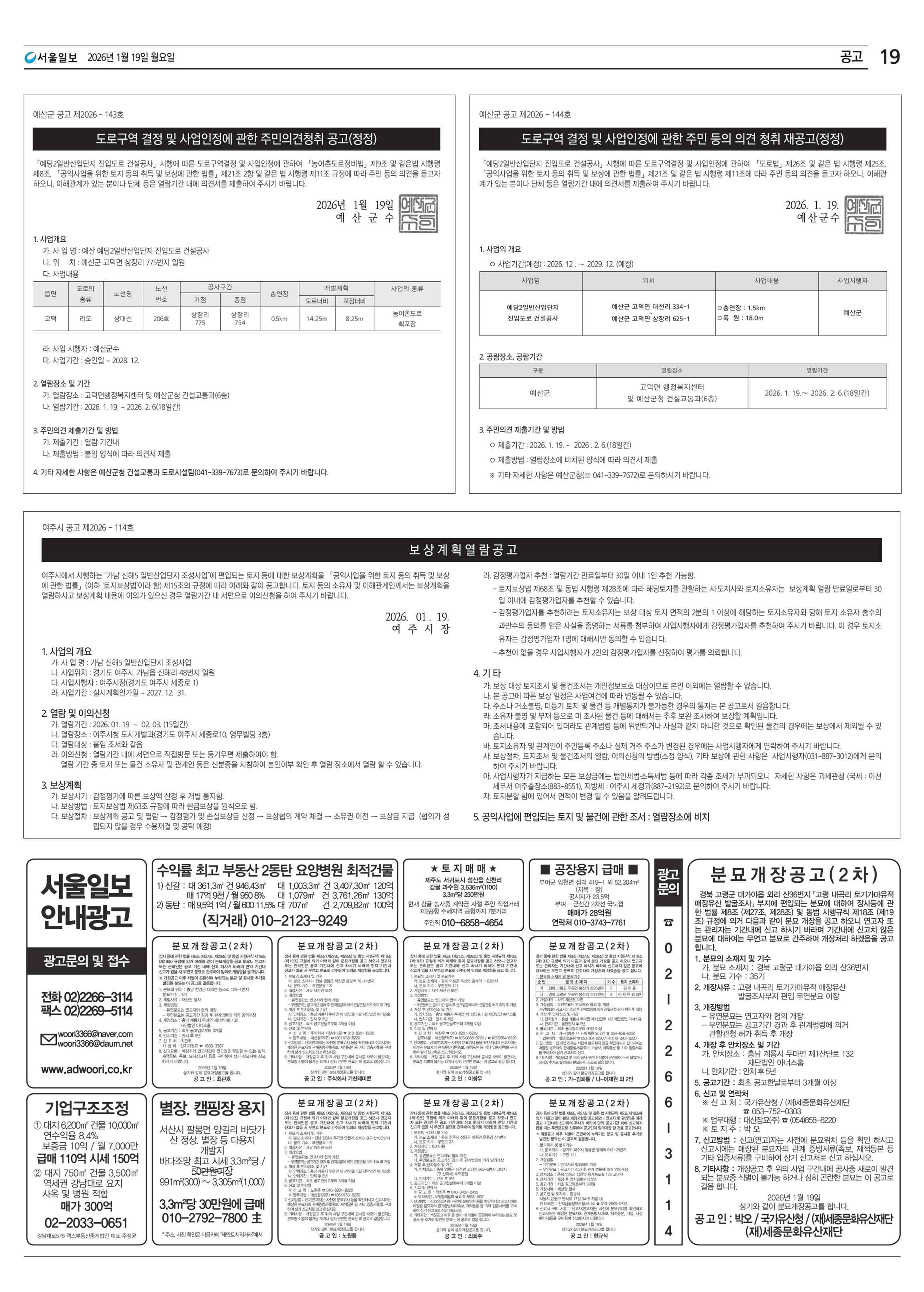 2026년 1월 19일(월요일) 서울일보 신문공고